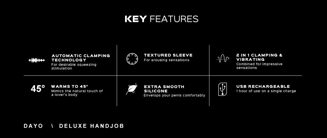 Smart-engineered with automatic clamping technology; with 7 sensuous wriggling clamping motions; the squeezing tightness on the tip of your penis and the vibrations to your sensitive shaft combined helps you reach the ultimate bliss, it knows how to please you where you want it most.
