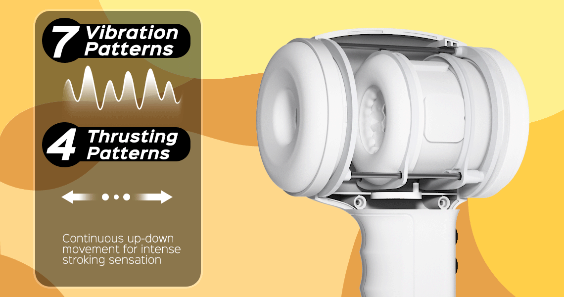 This new masturbator has an unconventional design with a user-friendly handle. You can easily touch the buttons to cycle through 4 thrusting patterns and 7 vibrating modes. With caps to either end, it's a discreet companion ready to join you on erotic adventures anywhere and anytime.