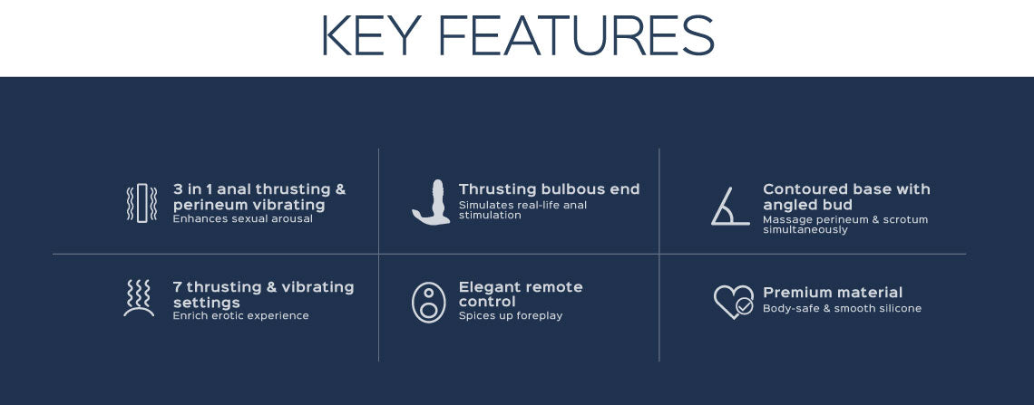 The prostate massager is ergonomically designed to fit a man's body, and it offers 7 intense thrusting and vibrating settings that guarantee a triple thrill in the anal, perineum, and scrotum simultaneously. You can explore your sexual arousal by interchanging modes from gentle to wild and feel the fondling on the perineum and scrotum. Invigorate your shaft with a variety of tantalizing vibrations. Ride the intensity of your booty pleasure and experience wave-after-wave of orgasmic ecstasy!