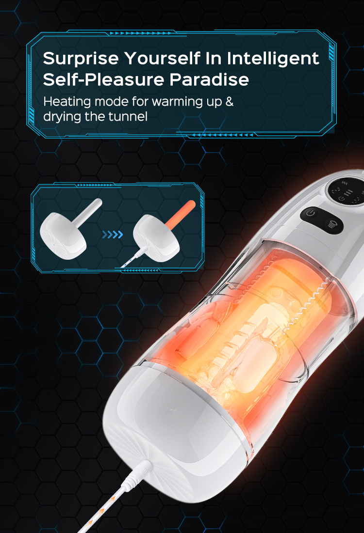 With its innovative screen display design, this male masturbator looks modern and functions well by showing you the vibration and suction intensities, as well as the remaining battery level. You'll never forget to charge the penis vibrator after use. The heated male masturbator takes you on a physical and sensual exploration journey by heating up to reach a human-like temperature and even helps to dry the tunnel after washing.